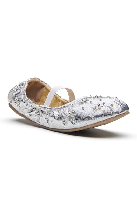 Silver toned ballerinas featuring bloom floral embroidery and an elasticated border