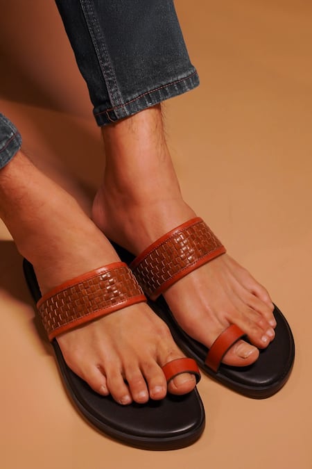 Black and brown leather sandals featuring a basket weave strap and toe ring design