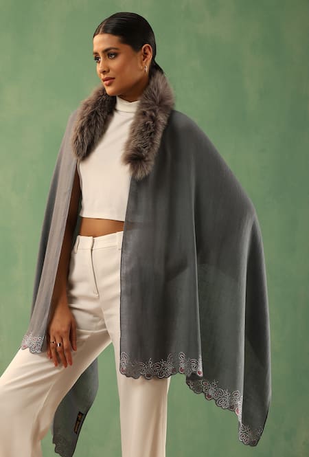 Grey Mishty Fur Collar Embellished Stole