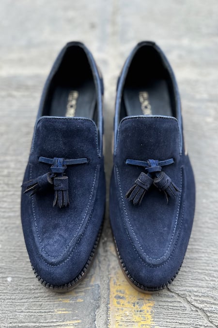 Navy blue loafers featuring suede tassel detailing and a classic design