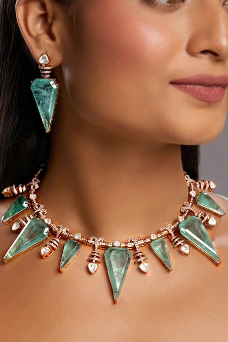 Geometric necklace set featuring clear and mint moissanite kundan polki, doublets, and zirconia embellishments. Includes a pair of matching earrings with push back clasp closure.