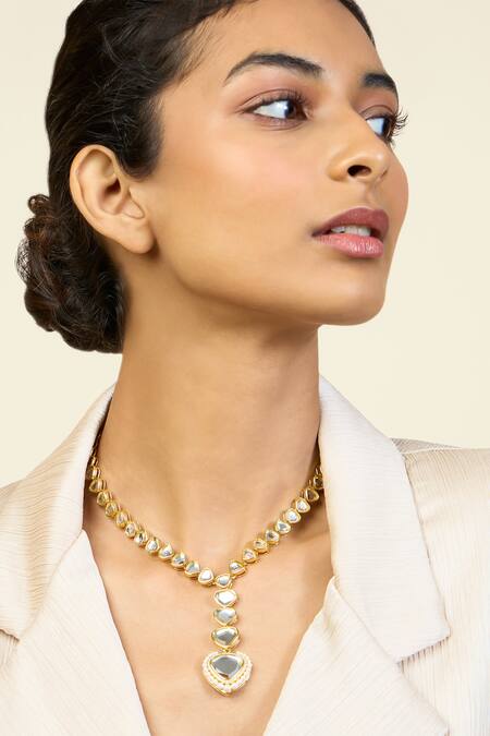 Gold long necklace featuring mirror, pearl & CZ embellishments