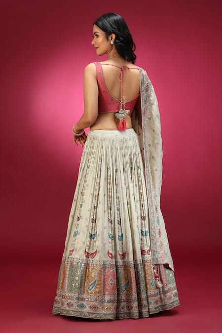 Cream lehenga set with printed motifs and embroidered border. The set includes a pink embroidered blouse and a matching dupatta.