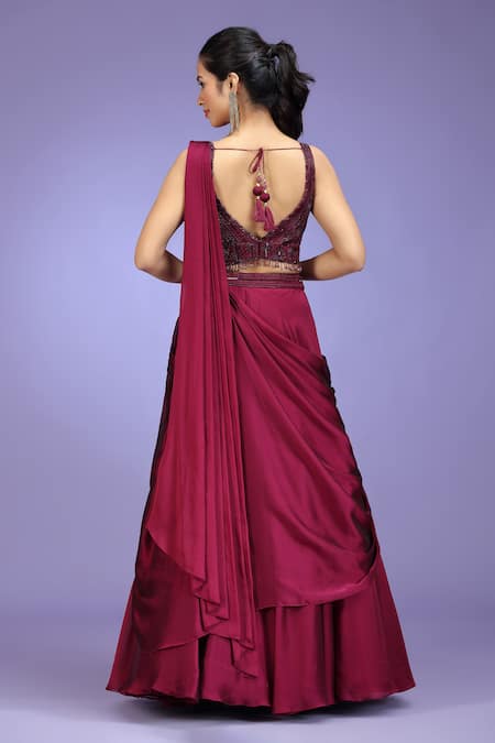 Wine lehenga with a draped georgette skirt and a heavily beaded blouse featuring fringe tassels. The set includes a matching dupatta.