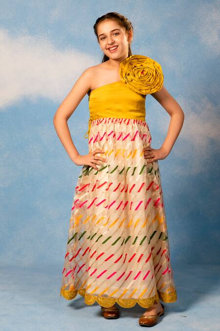 Yellow dress featuring an asymmetric neckline and floral motif detailing on one shoulder