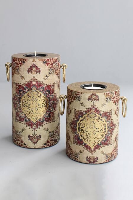 Ivory wooden candle holders in cylindrical shape with gold-tone ring detail & all-over print.