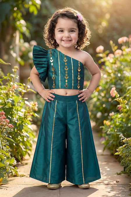 A teal green one-shoulder crop top crafted from premium soft silk with cotton lining, featuring a pleated ruffle sleeve, mirror embroidery, and gold foil detailing. It is paired with coordinating wide-leg elasticated palazzo pants.