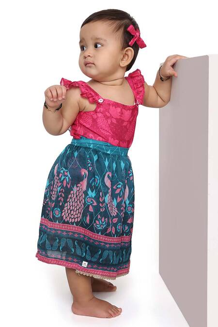 Turquoise blue wrap styled lehenga with peacock print and zari lace detail. Paired with magenta peacock print onesie.
