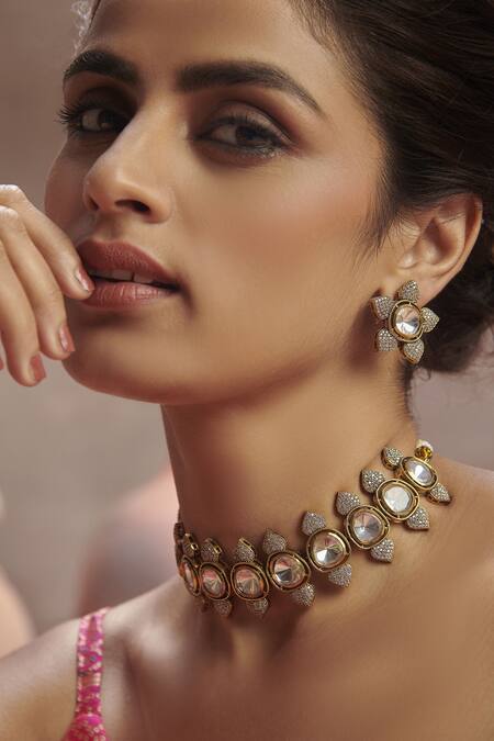 Gold & rhodium plated necklace embellished with Victorian polkis and zirconia. Comes with studded floral earrings.