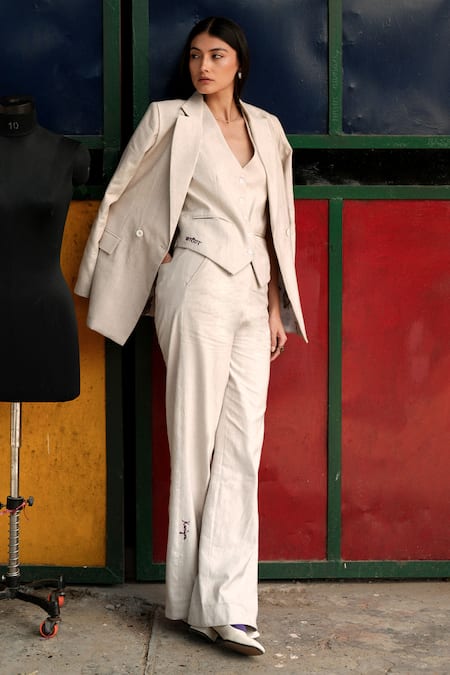 Off White waistcoat in handloom cotton with a fitted silhouette and front button closure. Clean seam construction maintains a structured finish.