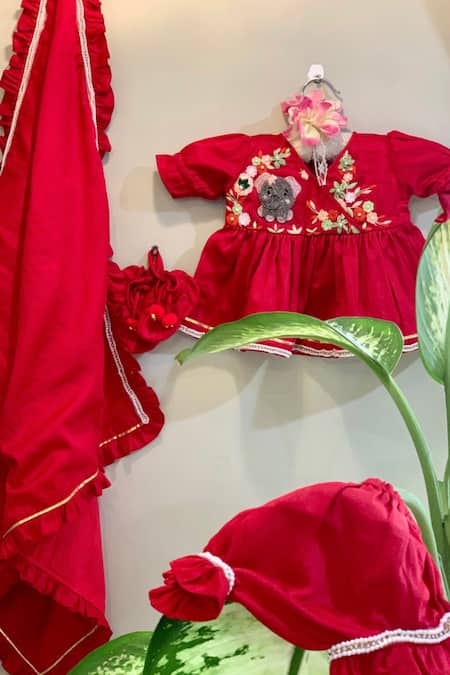 Red cotton silk dress featuring a surplice neckline and puff sleeves. Paired with bloomers, hairband, mittens, shoes, and a wrapper, all adorned with intricate bead and 3D floral embroidery.