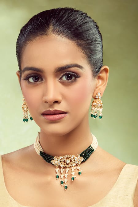 Green beaded necklace featuring brass base material with intricate embellishments. Paired with matching earrings adorned with dangling elements.