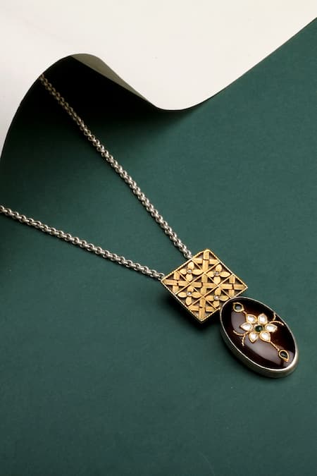 Gold toned carved pendant necklace featuring black labradorite and kundan stones