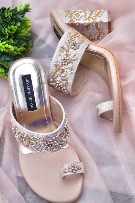 Peach embellished heels featuring floral cutdana straps and a slip-on closure