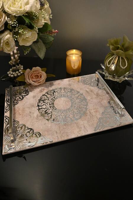 Beige, silver rectangle shaped tray with floral carved detailing & two handles on the sides.
