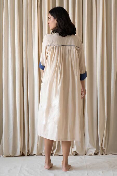 Beige midi dress featuring patchwork embroidery and gathers