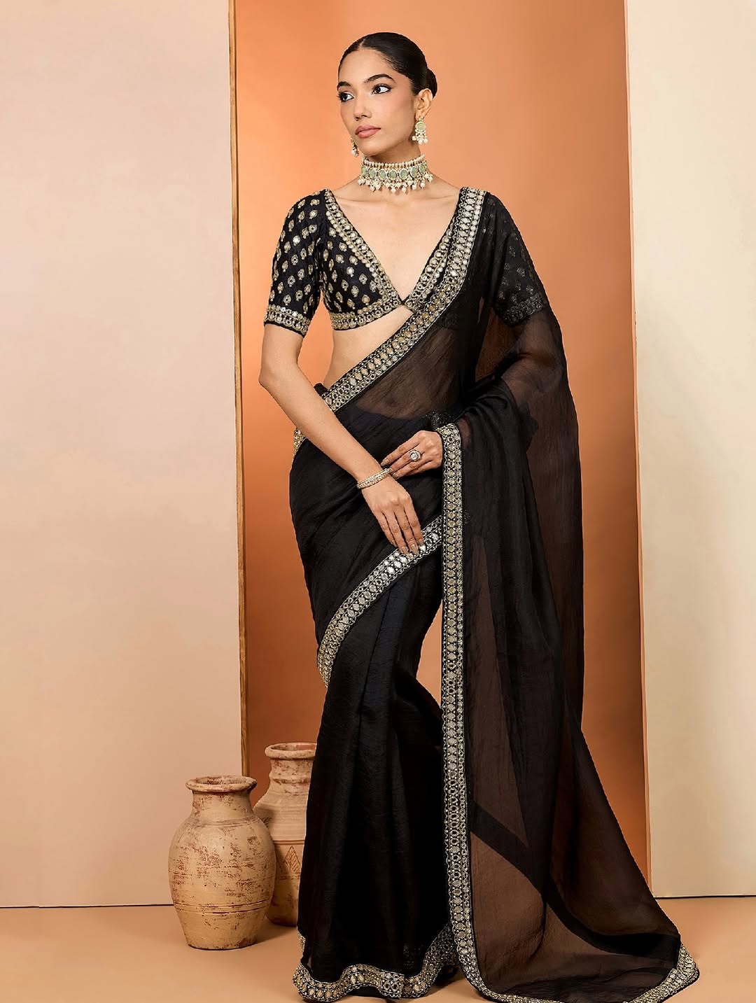 This drape saree blends sculpted detailing with fluid elegance — made for the moments when you want your outfit to speak first.