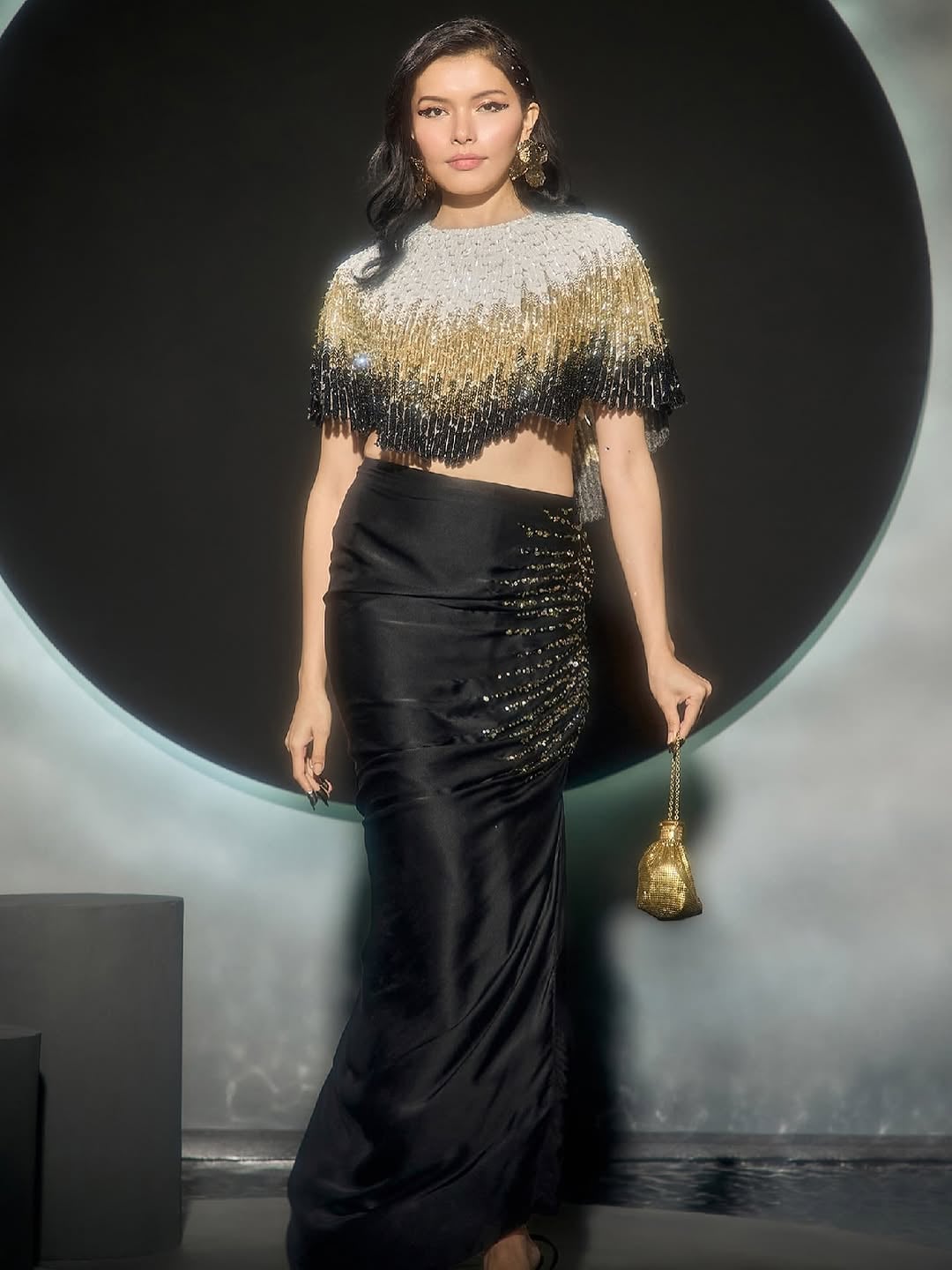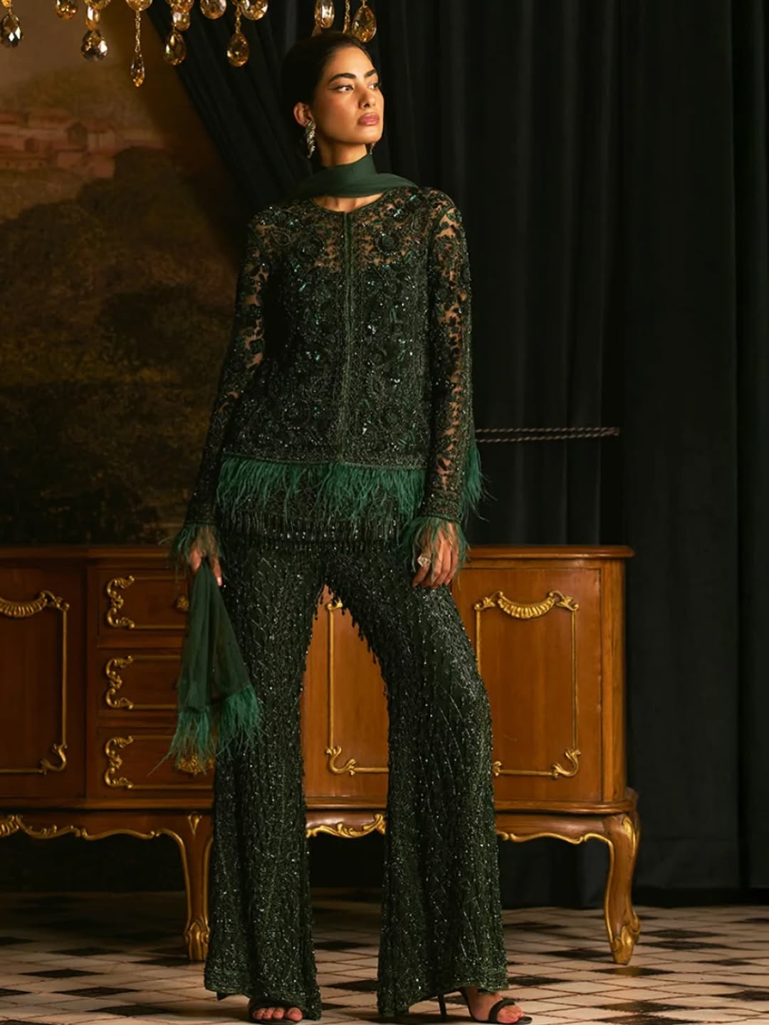 Statement pant sets and modern co-ord silhouettes, drenched in embellishments and finished with feathered flair — because power dressing deserves a little drama.