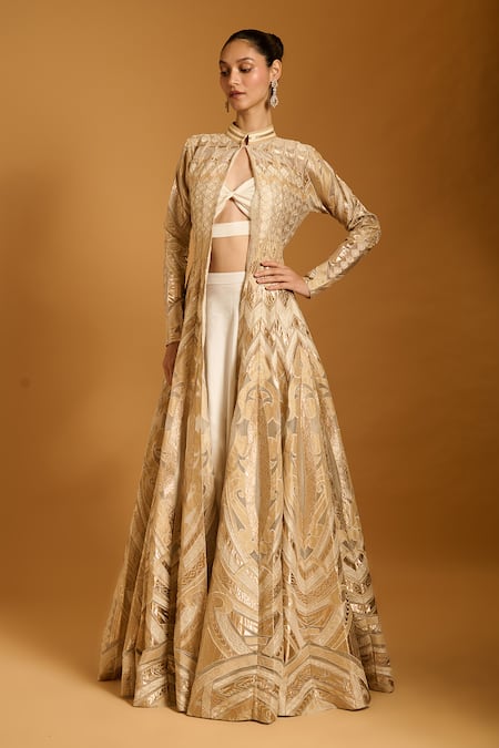 Gold Foil Pre-Stitched Saree With Bikini Blouse