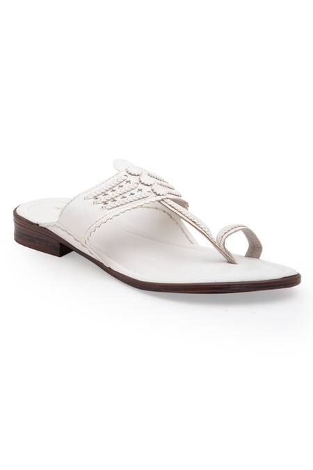 White Kolhapuri flats featuring braided strap, toe-ring, floral motifs, and cutwork detail