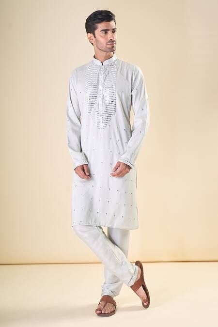 Sequin and thread embroidery on the kurta., Band collar neckline for a modern touch.