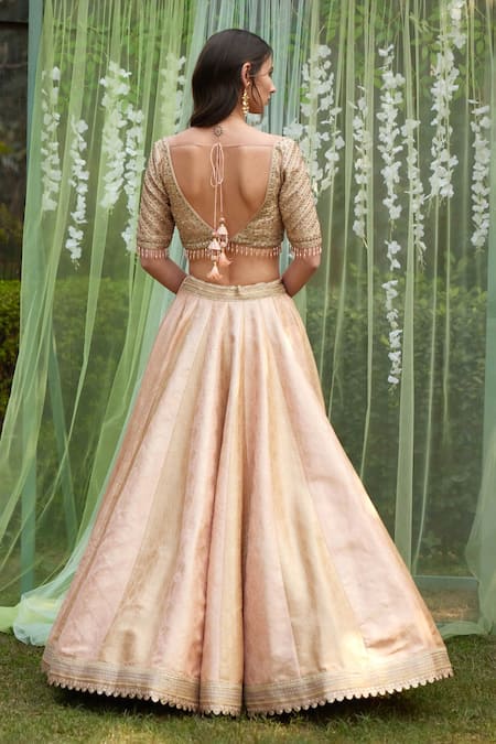 Old rose pink lehenga featuring zardozi embroidery on a multi-colored brocade base. Paired with a tassel bordered blouse, embroidered belt, and organza scallop dupatta.