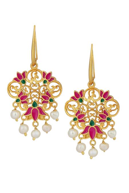 Gold drop earrings featuring pink and green enamel lotus motifs with filigree cutwork