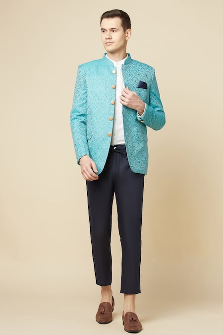 Turquoise jodhpuri jacket featuring floral embroidery, stylish buttons, and a premium lining
