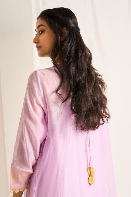 Purple kurta featuring leafy luna patchwork embroidery, ruffled neckline & pintucks detailing. Paired with a cotton pant and an inner.