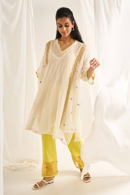 Off white kaftan featuring three fourth sleeves, V neck, and prism vine tissue patchwork embroidery. Paired with a lime green pant with stitchline embroidery and an inner.