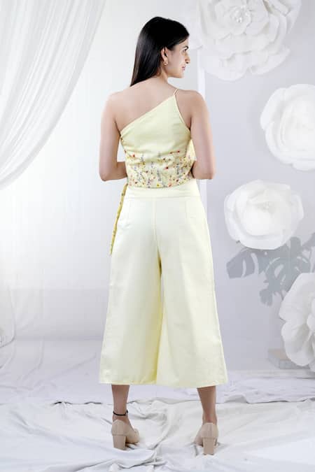 Yellow one shoulder top featuring floral printed border and noodle strap