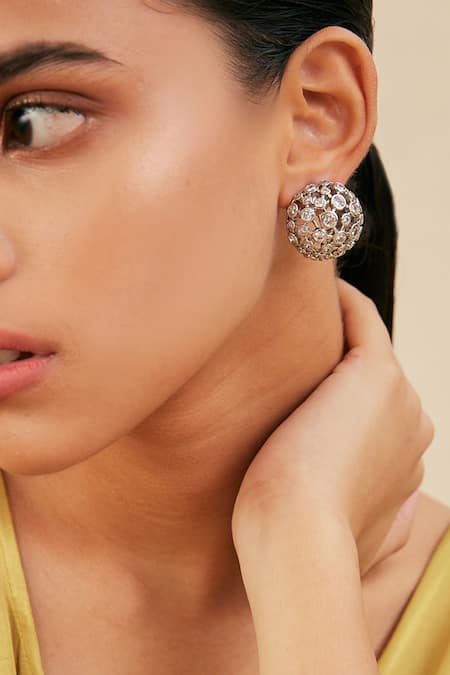 Silver stud earrings featuring a mesh design embellished with cubic zirconia