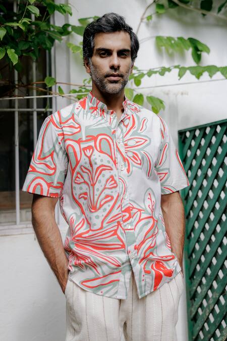 Beige shirt crafted in cotton poplin featuring abstract floral screen print detailing