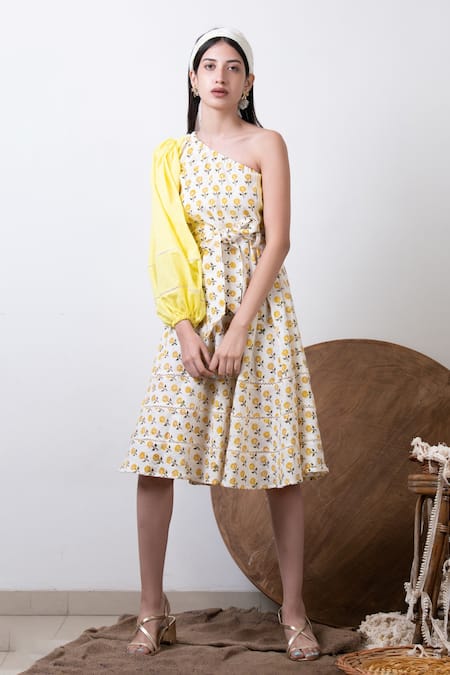 Yellow one shoulder dress featuring floral hand block prints and a front knot