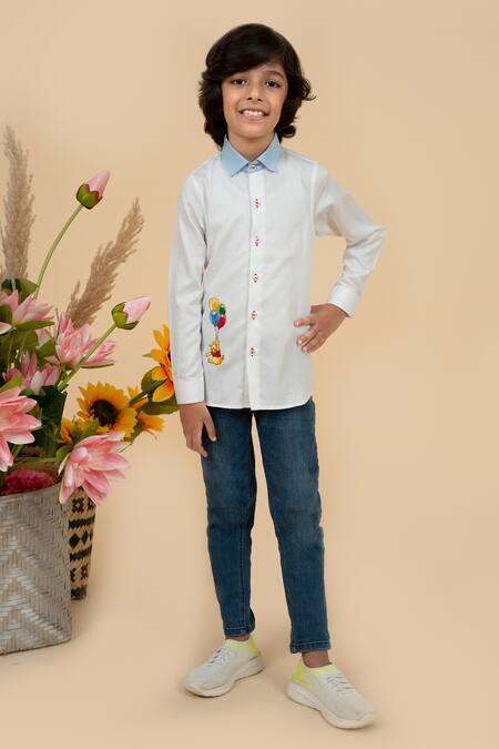 Buy_Little Boys Closet_White Cotton Satin Embroidery Winnie The Pooh Placement Shirt_Online_at_Aza_Fashions