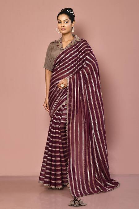 Wine saree with stripe prints. Paired with embroidered blouse.