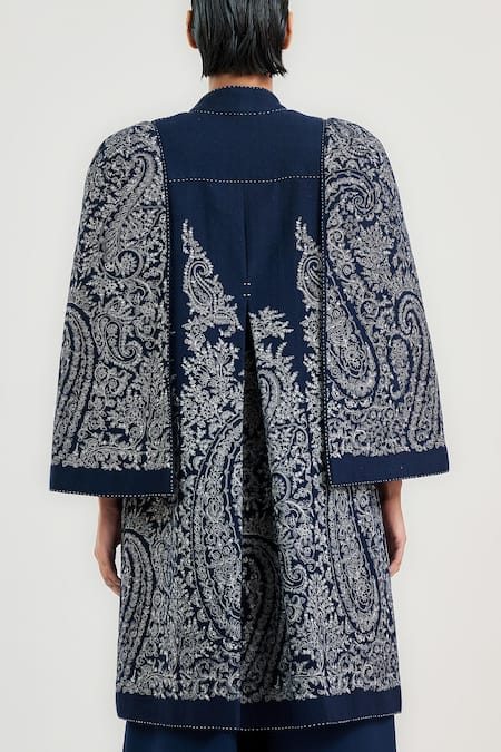 Navy blue jacket crafted from textured cotton featuring intricate paisley embroidery