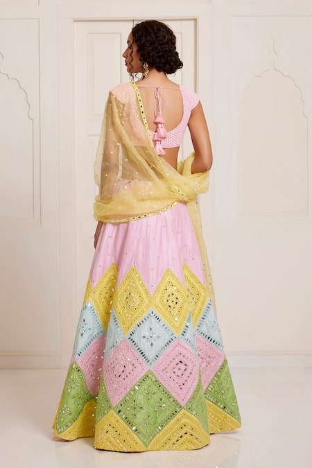 Pink lehenga set with mirror and bead embroidery. Paired with a yellow mirror organza dupatta.