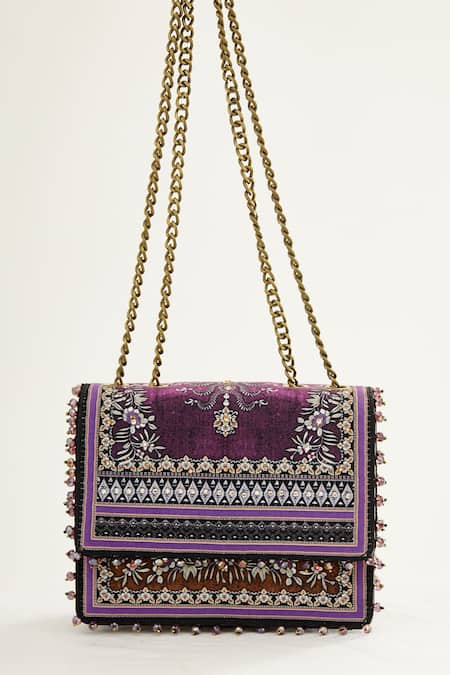 Purple sling bag featuring an envelope flap design with Japanese floral print and crystal work border