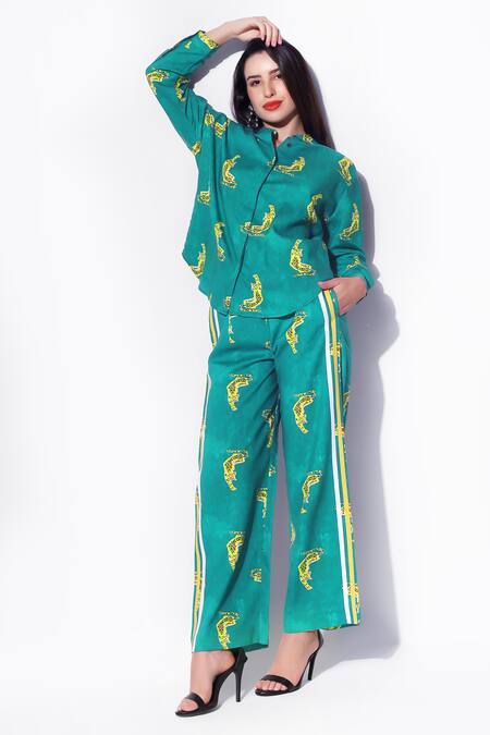 Green Egyptian Cotton Leopard Shirt Collar Jwala Pattern With Pant
