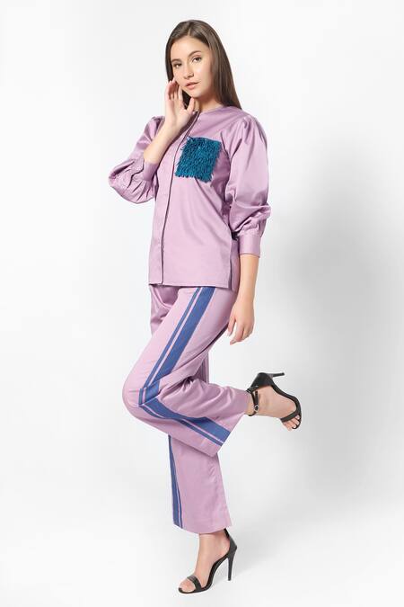 Lilac shirt featuring puff sleeves and placement fringe hand embroidery. Paired with matching pants that have side tape detailing.