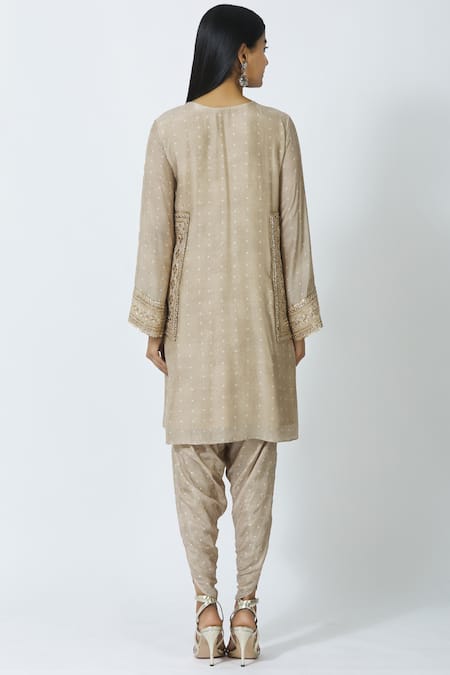 Beige Cotton Silk Round Embellished Kurta Dhoti Pant Set