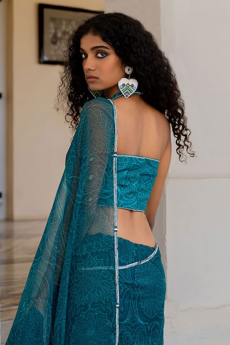 Teal blue saree featuring ruffle edges and hand embroidered border. Paired with a padded halter neck blouse.