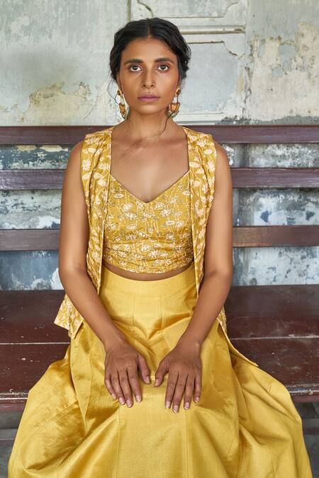 Mustard yellow short jacket with bead, leaf embroidery. Paired with padded bustier & butta embroidered skirt with attached cancan.