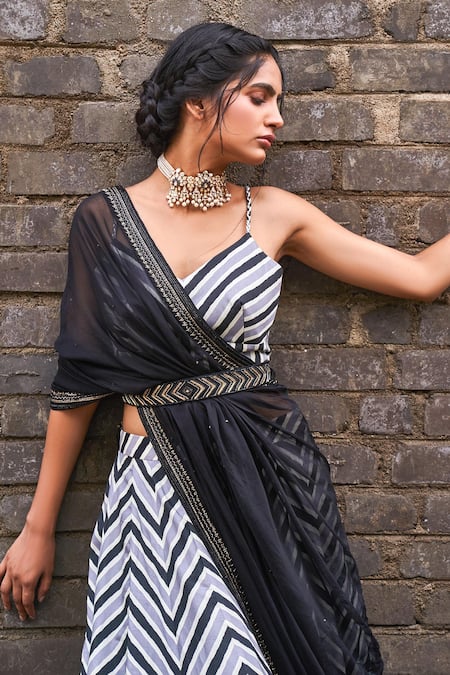 Black Organza, Muslin Silk Chevron Print V Neck Lyra Lehenga Set