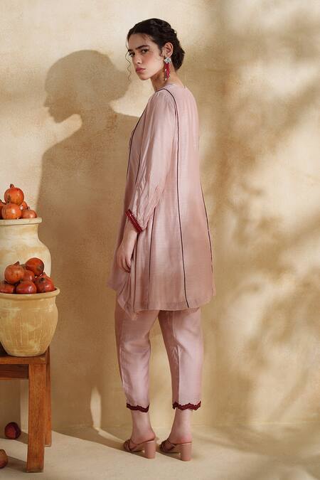 Pink kurta crafted from muslin cotton featuring floral embroidery and side slits. Paired with matching pink cotton pants with scalloped edges.