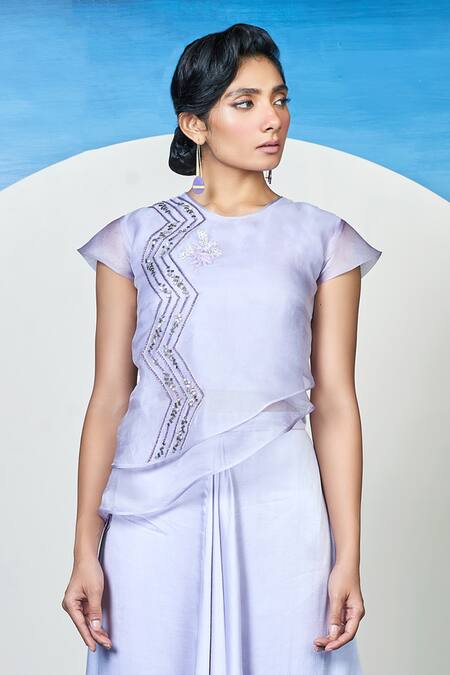 Lavender organza asymmetric top featuring placement sequins, beads, and stones embellishments in a chevron pattern. Paired with a pant that has layered skirt style drape and asymmetric detailing.
