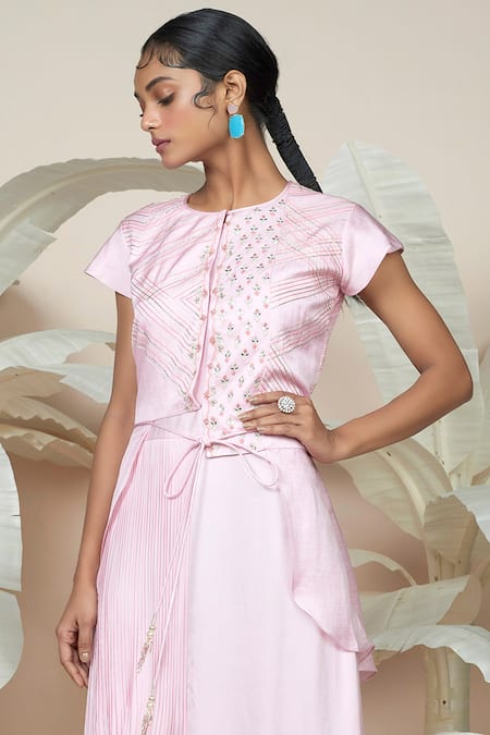 Pink Linen, Satin Embroidery Round Neck Annika Pleated Panel Gown With Jacket