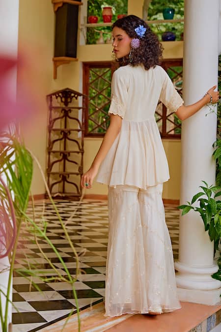 Beige peplum style kurta in organza with floral pearl, cut dana & sequin embroidery. Paired with a matching embroidered sharara and scalloped organza dupatta.