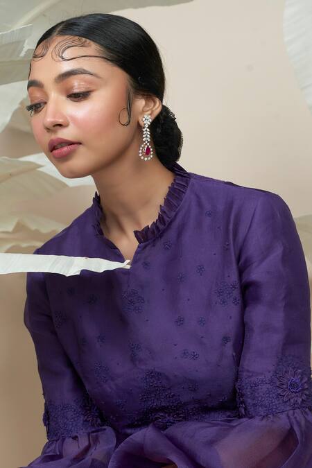 Purple organza gown featuring floral embroidery on the yoke and victorian sleeves